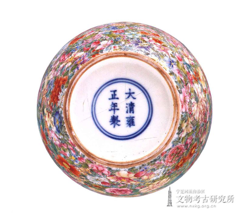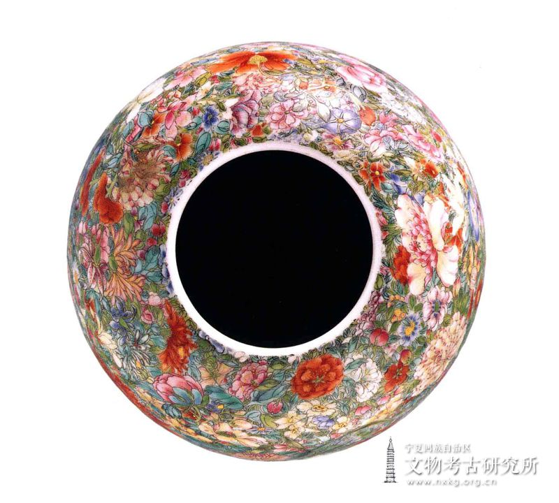 圆唇,敛口,曲腹,平底,器身满饰各种粉彩花卉图案,堆叠繁密,以红、黄、蓝、绿、白等颜料画成不同形状的花朵,寓百花呈瑞之意。