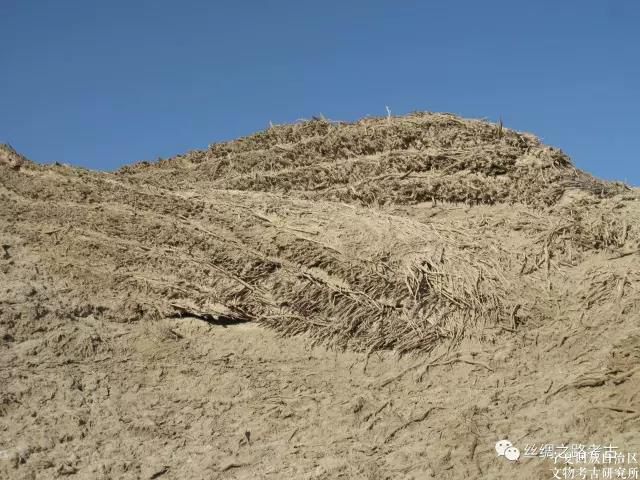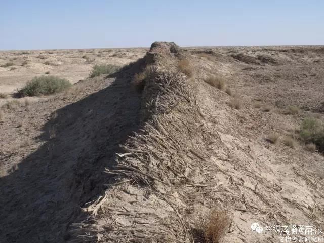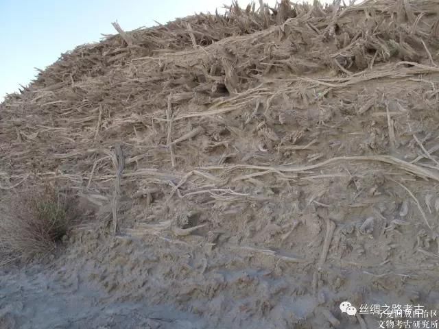 上层以红柳和梭梭等柴棍拌泥分层混筑,现存7~8层,高约1.7~1.8米。墙体为内外分体合筑,两侧平齐,中间填充,宽约1.7米。东墙长137.5米,南墙长126.5米,西墙长139米,北墙长126.5米,城墙周长约为530米(图三~图八)。四角似有角台遗迹。古城南墙略偏东处开一门,东侧南墙长54.3米,西侧南墙长67.7米,门址宽约4.5米左右。在北城墙中部有一处豁口,较窄,判断应不是城门遗址。古城平面不甚规正,西北和东南两角略呈钝角。城中央偏北处有一台基,东西长28米,南北宽18米。斯坦因在城中发现3件简牍、1张完整