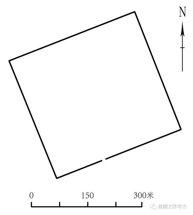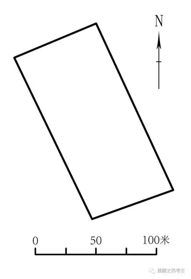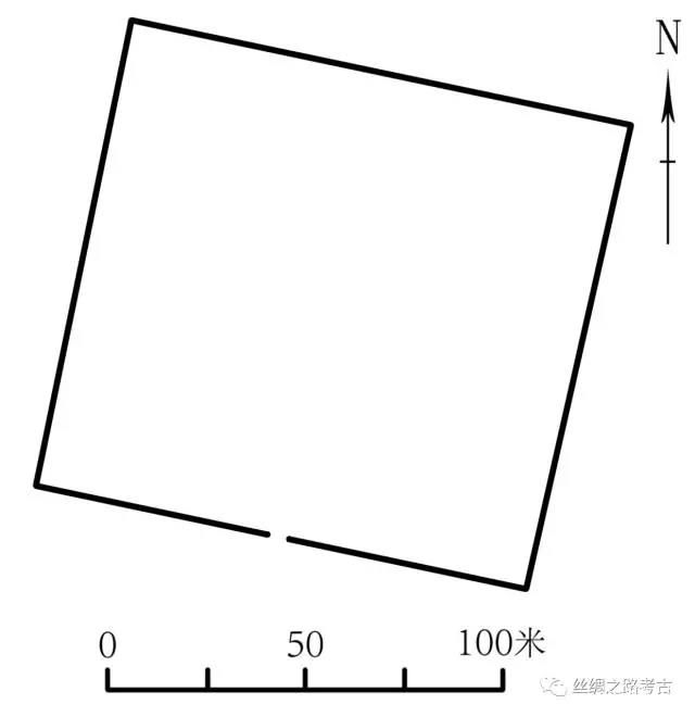 LL古城位于LA古城西南52.5公里处,古城西南角坐标为北纬40° 6'12.22",东经89°36'26.76",海拔802米。古城呈不规则长方形,方向为北偏西32º。东墙长66米,南墙长41米,西墙长65米,北墙长40米(图一七)。古城东南角东侧有凸出的长方形墙体建筑。