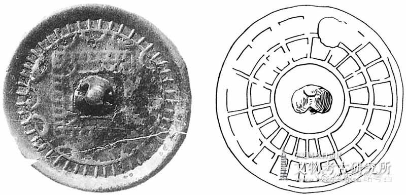 B型:斯鲁夫第2号墓地出土1件(图一四,1),圆钮如宽带,圆圈钮座,内区为七组内向连弧纹,外区为九组内向连弧纹,素缘。