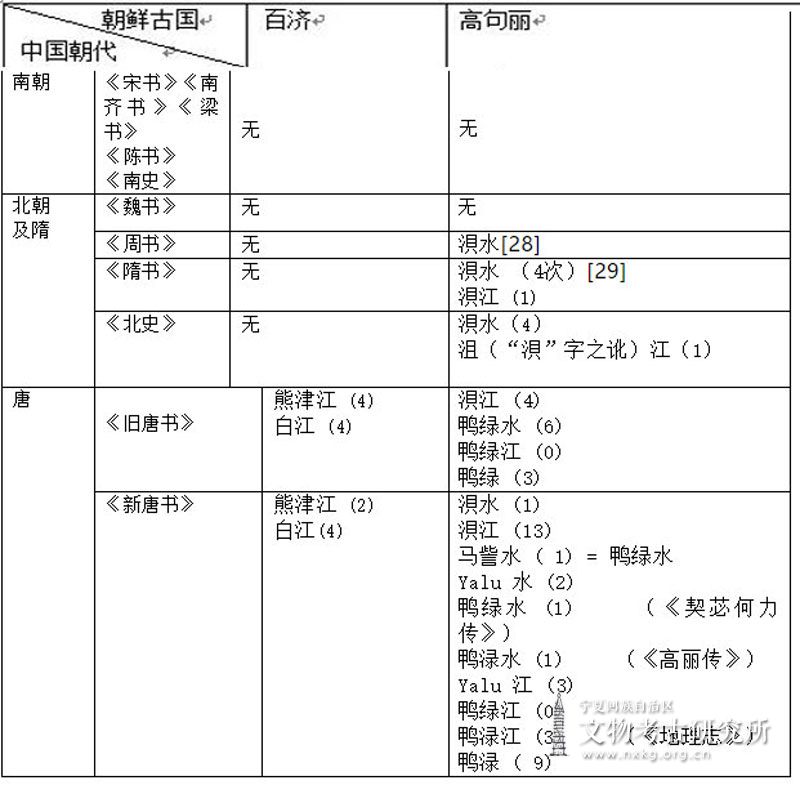 这样,江作为河流名称出现在朝鲜半岛便可以理解了。考察这一问题有很大的难度,主要因为半岛本土史籍编撰时代太晚,细节信息可信度不高。比如在《三国史记》高句丽、百济诸本纪中,“浿水”“浿江”“浿河”,“汉水”“汉江”“江水”“熊川水”“泗沘河”交替出现,没有时代规律可循,只能认为是后代史臣编撰体例不纯。中国正史中凡有记录的,《三国史记》等一仍旧文而时有错漏,反成为二手材料。另一方面,中国史料因有系统的年代顺序,加上在专名(地名、官名)记录上高度的准确性,更适合以考察这一问题。下表列出的是中国正史所记百济与高句丽境内的河流名称: