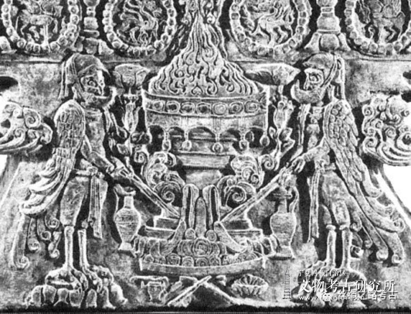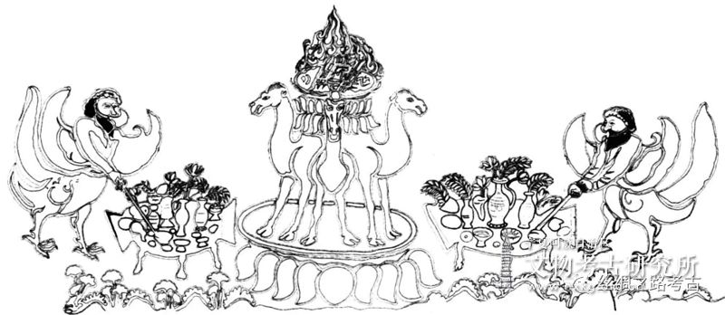 张广达指出:“安伽墓甬道尽头的石门的上部门额呈圆拱形,正面减地刻绘覆莲三驼座,莲座之上的圆盘供养火坛,火坛两侧各有一位祆教司祭,虞弘墓石椁上也有类似形象,祆教祭司的形象虽然在伊朗地区出土的印章纹刻中时有所见,但似乎也借用了中国神话中与火相关的阳燧鸟身和羲和人首以强调其宗教内涵。”26