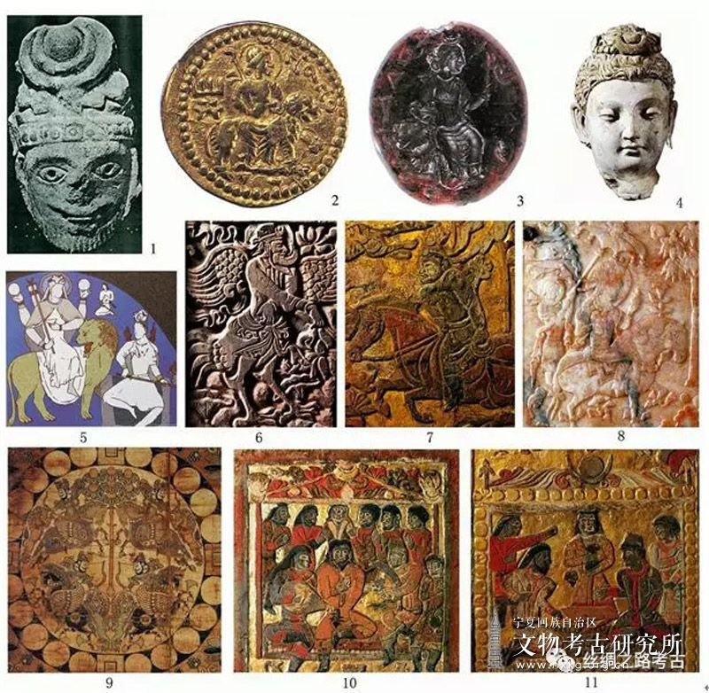 1:芝加哥艺术馆藏萨珊波斯卡瓦德一世(Kavādh I)头像 2:大英博物馆藏贵霜王朝胡维色迦(Huvishka)金币娜娜女神像 3:大英博物馆藏贵霜王朝娜娜女神印章 4:巴黎吉美博物馆(Guimet)藏阿富汗哈达(Hadda)地区出土佛陀头像 5:片治肯特(Pendjikent)壁画骑狮娜娜女神像 6:北周史君墓石椁前壁穆护图像 7:北周安伽墓石榻右侧屏风第1幅狩猎图 8:隋虞弘墓石椁壁浮雕第9幅 9:日本奈良法隆寺藏唐联珠狮文锦 10:北周安伽墓石榻正面屏风第1幅 11:北周安伽墓石榻正面屏风第4幅