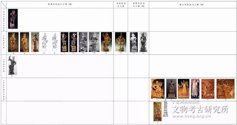1:洛阳龙门唐安菩夫妇墓出土 2a、b:西安唐越王李贞墓出土 3:偃师杏园M1928唐墓出土 4a、b:洛阳北郊唐颍川陈氏墓出土 5a、b:洛阳南郊关林配件厂唐墓出土 6a、b:西安中堡村唐墓出土 7a、b:西安唐金乡县主墓出土 8:西安唐韦美美墓出土 9:西安高楼村唐墓出土 10:西安东郊十里铺唐墓出土 11:四川邛崃石筍山石窟28号窟 12:日本京都教王护国寺兜跋毗沙门木像 13:四川乐山市夹江千佛崖石窟134号窟 14:重庆大足石窟北山第5窟 15:敦煌行道天王图 16:敦煌行道天王图 17:苏州瑞光塔四天王木函彩画