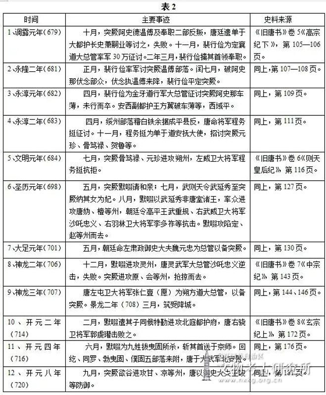 至于他参与的“争锋绝漠”,“绝漠”的方向应当是北方的草原和沙碛地带。《资治通鉴》在描述突厥降众阿史那伏念、阿史德温傅起兵反唐、唐廷调派裴行俭率军镇压之时,他遣派属下阿迦密等袭击对方之中选择“通漠道”48,此道就是进入康磨伽墓志所谓的“大漠”之道49。这一地带最重要的势力首推680年前后兴起的后突厥政权,它与武则天当政的周朝乃至随后的唐廷一直处于对抗的状态中50,这期间发生的唐军向北征战的事例如下表所示: