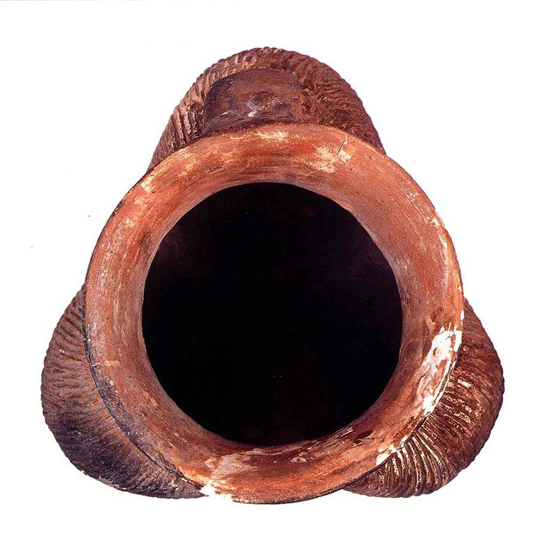 陶鬲,是中国古代很有特色的陶器,是当时居民的一种主要炊煮用具,系用黏土掺入大量的沙粒制成,不因受热膨胀而破裂,造型既美观,又科学实用,是原始先民长期生活劳动的智慧结品。这件陶鬲为齐家文化陶器,上部似罐,下部有三个叉开的袋形空心足,它们既可以使陶鬲放置稳固,又可以增加鬲的容量,增大与火接触的面积,加快炊煮的过程。三个足下面形成一个空裆,可以填柴生火,不需另外挖掘灶坑。器足下留有烟炱痕迹。