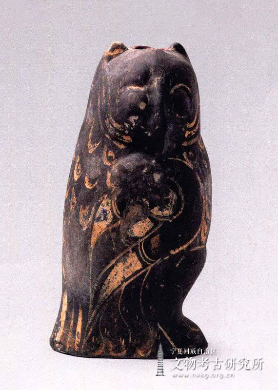 鸮,是猫头鹰一类的鸟,据古代传说,鸮是“阴间”的一种神鸟。该陶鸮呈站立状,翅尾下垂,全身为灰黑色,两眼圆睁,用白色点绘出肢爪翅羽,不仅给予了合理的艺术夸张,更给人以炯炯有神、高度警惕的感觉。头顶有一圆孔。器壁厚薄均匀,显示了西汉时期宁夏地区手工制陶业的发展水平。