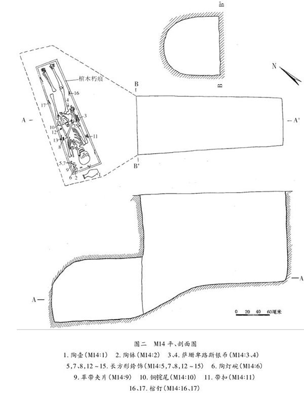 单人葬2例,为M14与M18。其中M14棺木东北—西南向置于墓室西部,已朽蚀。平面呈梯形,前、后挡板与两侧板、底板平齐。棺底板南北长2、前挡宽0.56、后挡宽0.4米,高不详。从墓室淤土中棺钉的出土位置和高度分析,棺高0.46米左右;从朽木痕测量,棺侧板和前、后挡板厚0.04米左右。墓室中部填土和底部朽痕周围出土较多铁棺钉,锈蚀严重,推测棺板间用铁钉钉合。棺内葬人骨一具,仰身直肢,头向西南,面朝上(图二)。骨架长1.85米,左手置于腹部,两手处各出土1枚萨珊银币,当时应是手握银币。人骨保存完好,经鉴定,为45岁左右男性个体。
