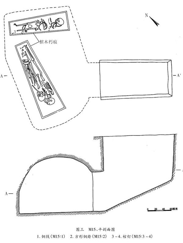 异棺三人合葬1例,为M15。在墓室北部和南部西侧各放置棺木一具(图三),平面呈梯形,均朽蚀。北部棺木呈西北—东南向,长1.5、前挡宽0.5、后挡宽0.34米,高不详。棺木内置人骨一具,呈仰身直肢状,头向东,面朝上。骨架长1.2米,骨骼零乱,左右腿骨拼凑痕迹明显,据此判断应是迁葬。经鉴定,该人骨年龄5岁左右,性别不详;南部西侧棺木呈南北向,棺长1.94、前挡宽0.64、后挡宽0.34米。棺木内置人骨2具,属同棺合葬,人骨头向均朝南。其中东侧人骨保存较好,呈朝西侧身直肢状,仅头骨和右肢骨略有扰动,其余骨骼保存完好,经鉴定,为一男性,年龄45~50岁。西侧人骨除头骨朝南外,其余骨骼均非常凌乱,应属迁葬。经鉴定,为一女性,年龄30~35岁。[page]