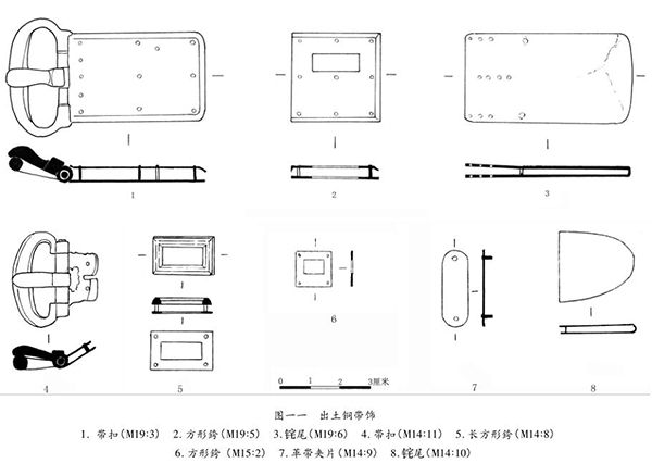 2.铜器 基本为带饰,有铜带扣、銙、尾、革带夹片(图版三,1)。其中M14尾出自左股骨头附近,带扣出自人骨右臂处,长方形銙出自人骨左臂处。从带饰出土的位置看,分布较为随意,可能是将带饰拆分后放入(图一〇)。M15的方形銙出自北部棺人骨胸部。M19的带扣、方形銙和尾出自东部人骨骨盆周围。