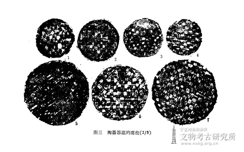 席纹是制作圆饼状器底时从席子上印上去的,并非有意装饰。从席纹上观察,席子是用草类编成:用宽扁草作经线、细圆草作纬线,一般编成“十”字纹(图三,1—4、6、7),个别编成“人”字纹(图一〇,6)、“之”字纹(图 ,5)。其中有的圆饼底拍打一次后,从席子上取下来,稍微转动一下,又放在席子上拍打,前后两次印成的席纹形成斜向叠压的现象(图三,6)。