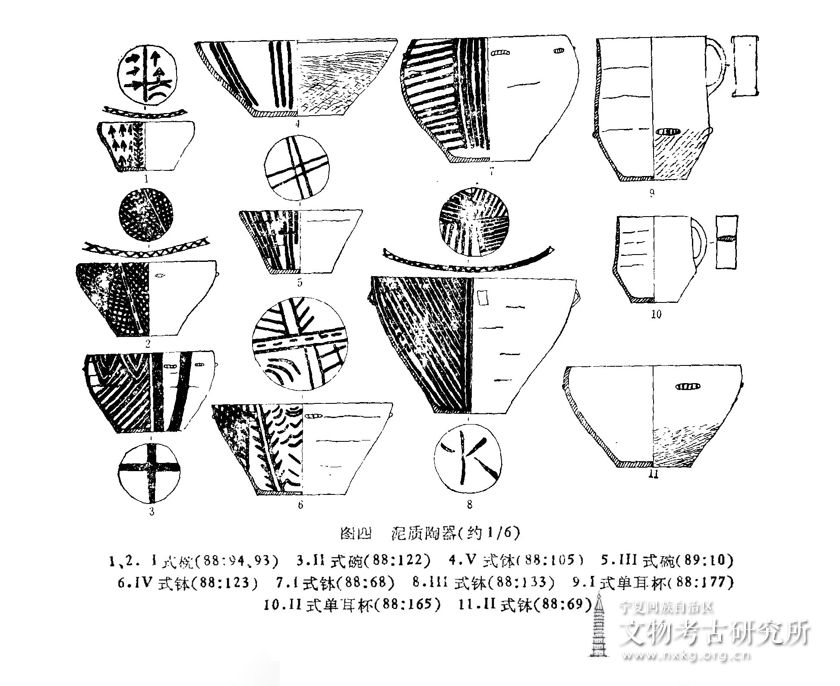 红圈子墓地有些陶器类似于马家窑文化的半山类型:例如泥质Ⅳ式单耳罐88:111 与甘肃景泰张家台Ⅳ式彩陶罐M5:1(《考古》1976年3期,图版肆,4)的器形及纹饰都相似;Ⅲ式泥质钵88:133的内彩图案与柳湾Ⅲl型Ⅰ式盆599:1(《青海柳湾》,图版三九,1左)相似;泥质单耳罐Ⅰ式88:95口内的折线纹与柳湾Ⅰ型2式瓶(《青海柳湾》,41 页,图三,2)的“多线波折纹”相似;夹砂Ⅸ式单耳罐88:151的窄条附加堆纹上用工具压成齿状,类似的附加堆纹见于张家台Ⅱ式粗陶罐M10:1(《考古》1976年3期,图版肆, 3)、甘肃兰州花寨子的粗陶(《考古学报》1980年2期,图版柒1—4;图版捌,2、4)、甘肃广河地巴坪的Ⅱ式粗灰陶小罐49:14(《考古学报》1978年2期,图版玖,6)和柳湾的粗陶双耳罐(《青海柳湾》,49页,四三五,11),只是附加堆纹的排列方法不同罢了。