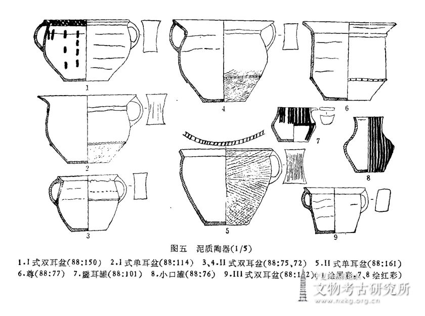 制法均为手制,采用泥条圈筑法成型,杯、碗、钵、盆、尊、罐、壶的内外表留有泥条之间的缝隙(简称泥条缝隙)。方法是:首先在草席上将一块泥料拍打成圆饼状器底,然后在圆饼边缘的上侧用泥条筑成器壁,例如泥质Ⅲ式双耳罐88:81(图七,5)和泥质Ⅱ式单耳壶88:126(图七,8),或者在圆饼边缘的外侧用泥条筑成器壁,例如泥质Ⅰ式双耳壶88:70 (图八,5)。 器壁用泥条一圈圈累叠而上,即泥条圈筑法,每圈泥条首尾衔接,例如泥质Ⅰ式单耳杯88:177(图四,9)、泥质Ⅱ式碗88:122(图四,3)、Ⅲ式碗89:10(图四,5)、泥质Ⅳ钵88:123(图四,6)、泥质Ⅰ式双耳盆88:150(图五,1)、夹砂Ⅱ式单耳罐88:65(图一〇,10)。一部分泥质陶器外表及口内磨光,大部分泥质陶器表面只用湿手抹平,简报中未提到磨光的泥质陶器皆抹平。未见慢轮修整痕迹。