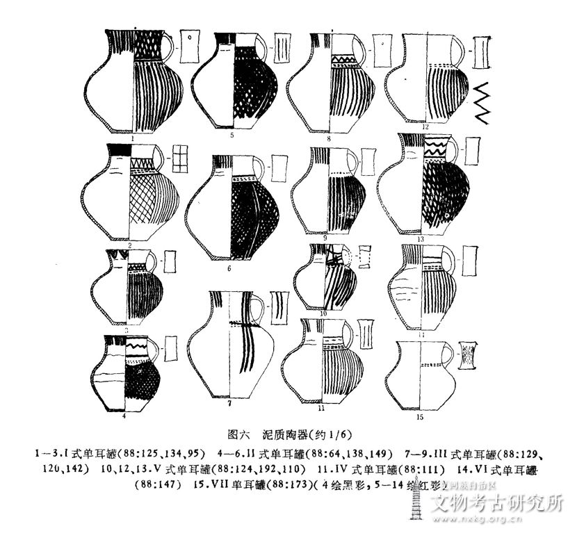 Ⅱ式:5件,皆彩陶器。领与肩无明显分界,略呈圆腹,最大径在腹中部。88:138,橙黄陶,领内壁有泥条缝隙。颈部有戳印纹二周,耳上有竖划纹三道。绘红彩:外表领下部和肩部有平行条纹三周,折线纹一周,腹部有竖条纹三组,每组三道,将腹部分为三部分,再绘菱格纹,口内有竖条纹八组,其中两组各四道,六组各三道。口径7.6、底径6.4、高16.4厘米(图六,5)。88:64,橙黄陶,内壁有泥条缝隙。颈部有戳印纹二周。绘黑彩:外表领上、下部各有平行条纹一周,其间有折线纹一周,颈下有横条纹一周,腹部有菱格纹;口内有平行条纹一周,以下有竖条纹七组,每组三道。口径8、底径6、高13厘米(图版壹,1;图六,4)。88:149,橙黄陶,领内壁有泥条隙,外表及口内稍磨光。颈部有戳印纹二周。绘红彩:外表颈部有平行条纹二周,腹部有竖条纹四组,每组三道,将腹部分为四部分,再绘菱格纹;口内有竖条纹。口径 7.4、底径7、高18厘米(图六,6)。