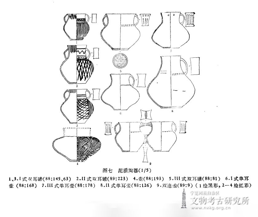 Ⅲ式:8件,皆彩陶器。领与肩无明显分界,腹上部凸鼓。88:142,橙黄陶。颈部有戳印纹一周。绘红彩:腹外表及口内有竖条纹。底下印有席纹。口径6.8、底径7.4、高14.8厘米(图六,9)。88:120,红陶。颈部有戳印纹二周,耳上有圆镂孔一个。绘红彩:外表领下部和肩部有平行条纹三周,折线纹一周,腹部有竖条纹;口内有竖条纹六组,每组三道。口径8、底径7、高17厘米(图版壹 图六,8)。88:129,橙黄陶。颈部有戳印纹三周。绘红彩:外表领部、腹部各有竖条纹六组,每组三道;口内有竖条纹四组,每组三道,耳上有竖条纹二道。底下印有席纹。口径7.5、底径7、高18.5厘米(图六,7)。