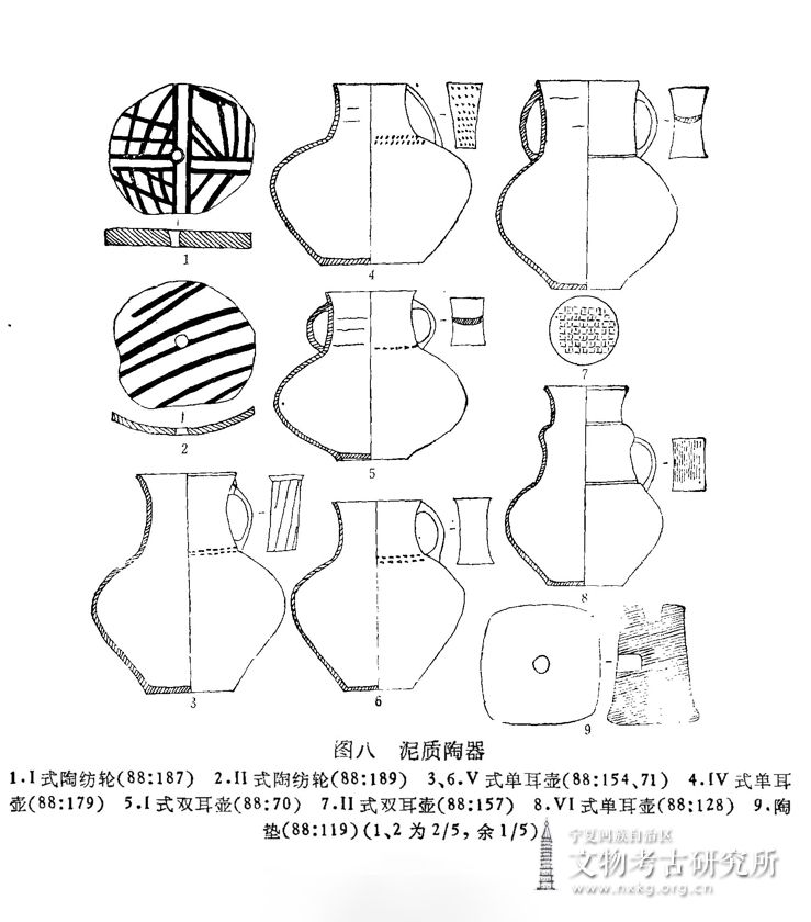 Ⅰ式:2件。圆唇,领与肩无明显分界,扁圆腹,最大径在腹中部,半环形耳。88:168,灰陶,颈部有凹弦纹一周。底下印有席纹。口径8.4底径6、高15厘米(图七,6)。