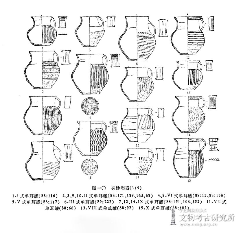 Ⅶ 式:2件。领与肩有明显分界,扁腹,最大径在腹上部。88:66,灰陶,含细砂,领内壁有泥条缝隙。腹上部有戳印纹五周,下部以斜绳纹为底,再施曲线划纹。耳上部有圆镂孔一个。口径8、底径6、高9.1厘米(图版壹,4;图一〇,11 )。