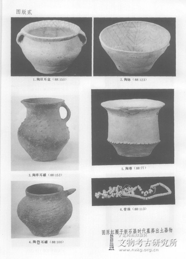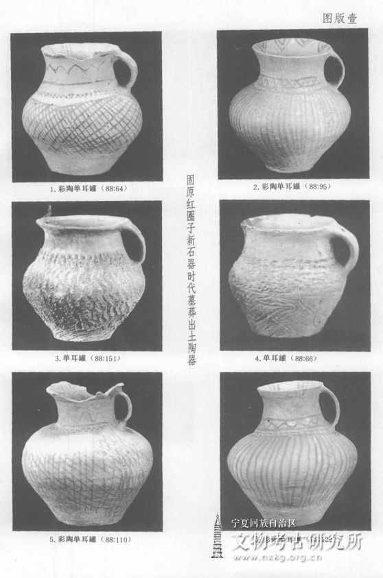 红圈子墓地与宁夏海原县菜园村林子梁遗址(地处北纬36°32',东经105°33 ')直线距离仅60公里。红圈子墓地的主体部分与林子梁遗址第一期有密切关系,例如红圈子的夹砂单耳罐Ⅱ式88:159、88:163与林子梁的小口单耳罐M2:2、3(《文物》1988年9期,4页,图五,14、15)的竖划纹是相同的。红圈子墓地的泥质和夹砂单耳罐共有58件,占征集陶器总数(118件)的49.15%,单耳发达这一点也与林子梁遗址第一期相同。但两地陶器总的特征存在差异,尤其与林子梁遗址第二期的差异更明显。该墓地的资料对于研究宁夏南部新石器时代晚期的文化内涵具有重要意义。