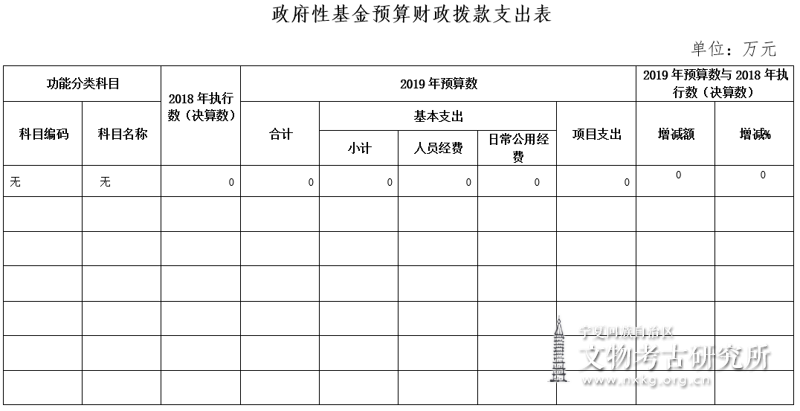 无政府性基金预算财政拨款单位:宁夏回族自治区文物考古研究所2019年无政府性基金预算财政拨款收支。
