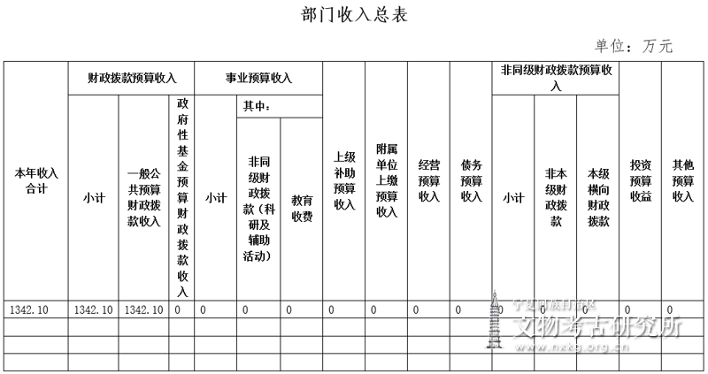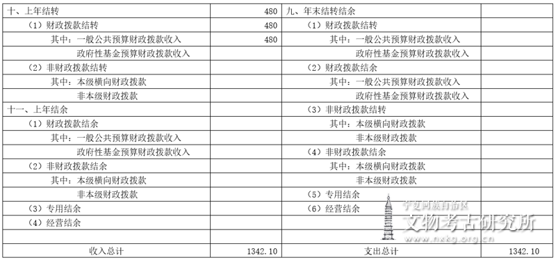 宁夏回族自治区文物考古研究所2019年收入总预算 万元,其中:本年收入1342.10万元,上年结转结余480万元;支出总预算1342.10万元,其中:本年支出1342.10万元,年末结转结余0万元。
