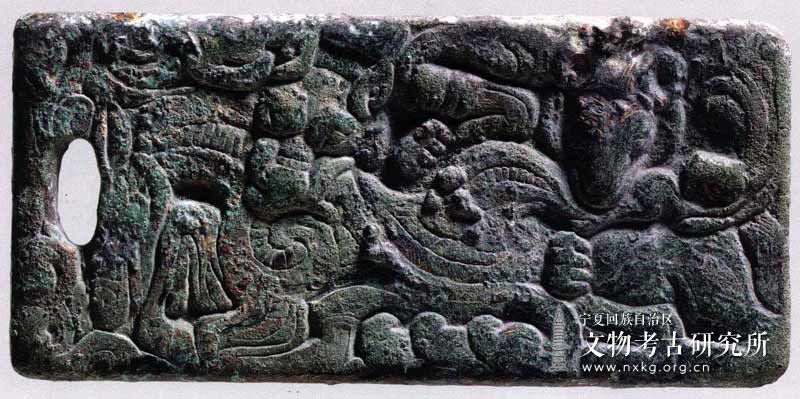汉代 青铜质 长11 4厘米,宽5 3厘米,厚0 4厘米 1972—1983年宁夏吴忠市关马湖汉墓出土 长方形,正面浮雕有虎、羊图案,虎头在近扣孔处,扣孔椭圆形,羊头在另一端,羊咬虎尾,背面有两个凸起的扣钮。该牌饰虽锈蚀严重,但动物搏斗场面仍十分生动,引人注目。[详细] -