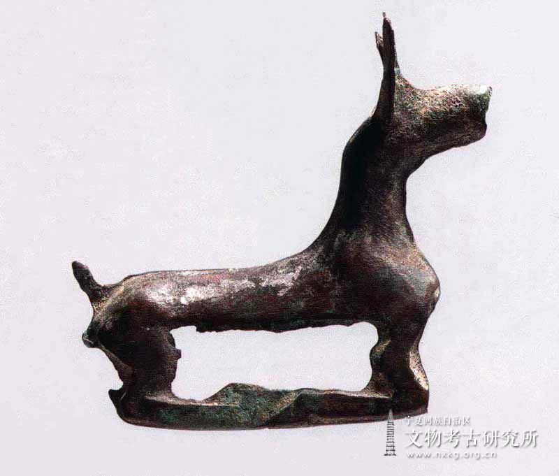 汉代 青铜质 高4 5厘米,长7 5厘米 1985年宁夏同心县倒墩子汉代匈奴墓地出土 羊呈蹲跽式,中空,嘴微张,圆眼,耳际两边均有一圆形孔,四腿曲卧,背部平直。羊身各部比例适中,棱角分明,造型准确。 宁夏同心县倒墩子汉代匈奴墓地的发掘,初步揭示了匈奴降汉以后的社会经济状况和生活习俗。这里共发现墓葬27座,出土遗物1600余件,有陶、铜、铁、石、骨、金等各种质地的器物,尤其五株钱、珠、贝壳等,在宁夏[详细] -