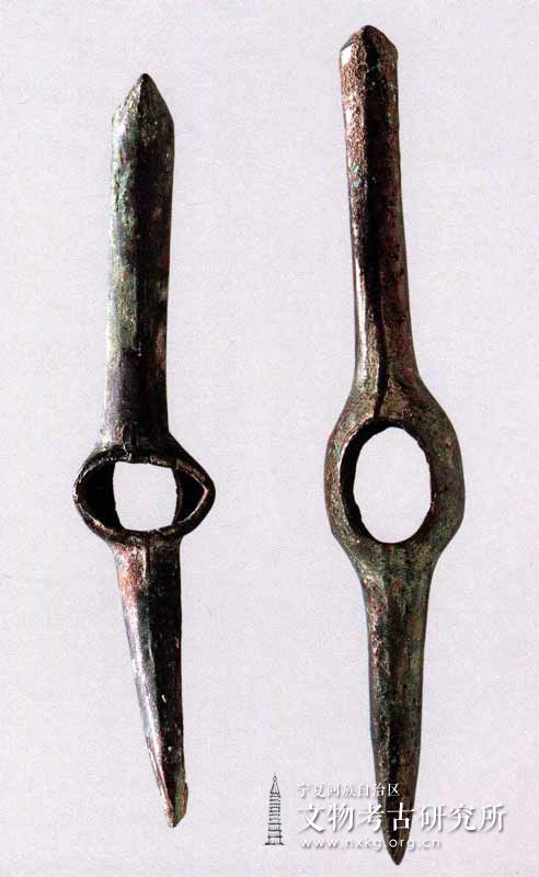 汉代 青铜质 1983年宁夏同心县倒墩子汉代匈奴墓地出土 这两件铜斧中间有签,呈椭圆形,銎径分别为1 7厘米×1 1厘米、2厘米×1 9厘米。一端呈扁刃斧状,銎至斧刃一端长分别为4 9厘米和5 0厘米;另一端稍尖,呈圆锥形,与鹤嘴相仿,銎至鹤嘴一端长分别为6 2厘米和5 5厘米。该器整体造型简洁,设计构思巧妙。既可以啄击又可以劈杀,是凶悍的战争武器。在古代北方草原游牧民族青铜兵器中,鹤嘴斧堪称是古代兵器[详细] -