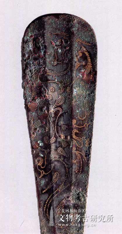 该器作长条倒钩形,长把短钩,前挺后弯。琵琶形腹,器面中部起两凸棱,有错金纹饰,点饰龙纹及其他动物图案,背面有一个圆形钮。整件器物如一只琵琶,造型精巧美观。