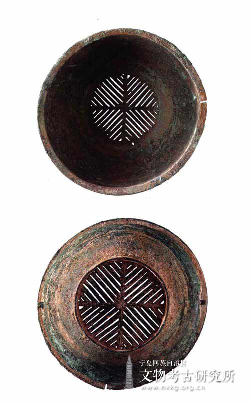 出土时釜、甑分别铸造又套合在一起。甑,口径28.4厘米,底径13.7厘米,圈足高1.6厘米。敞口,平折沿,方唇,斜腹微鼓,矮圈足,腹上部环一道凸弦纹,两侧饰兽面铺首衔环,底部按四等分镂成条齿形孔。釜,口径12.8厘米,腹径28.1厘米。弇口,方唇,斜折肩,肩棱明显,鼓腹,圜底。口沿下有凸弦纹一周,肩两侧对饰铺首衔环,环呈桥形穿孔,肩腹环以扁宽凸棱。出土时釜内有一个大铜勺。甑的圈足可与釜口套接,共同组成甗。