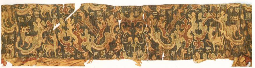 作为反映社会意识形态的重要载体之一,丝绸图案的设计必然也会受到整个社会企慕神仙世界、渴望得道升仙氛围的影响,因此,出现了大量以神仙灵异为主题的云气动物纹锦,如元鼎元年(公元前116),热衷于神仙之说的汉武帝在甘泉宫西起招仙灵阁,“编翠羽麟毫为帘,……有霞光绣,有藻龙绣,有连烟绣,有走龙锦,有云凤锦,翻鸿锦”,用以营造神仙气氛,连璧锦应也属此类。