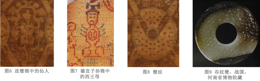 尼雅出土的德宜子孙锦上有类似的人物形象,头上戴胜,被认为是《山海经》中提到居于昆仑之丘的西王母(图7)[2]。虽然此件连璧锦中的人物头上未戴胜,不能确定是否也是西王母,但从其身长羽翼来看,至少是神仙一类的人物,王充《论衡》中载“图仙人之形,体生毛,臂变为翼,行于云则年增矣,千岁不死”。汉代神仙思想盛行,人们认为凡人要脱离生死、修行升仙就必须经过羽化的阶段,所谓“中生毛羽,终以飞升”,因此汉代的墓室壁画中也有大量羽人引导的乘龙飞升图;第三行菱格中一对相背而立的四爪瑞兽,头上长角,身上有斑点,尾巴弯曲上翘,作回首对望状,在两兽之间有一株花树;第四行菱格中是另一对四爪动物,身形细长,作弯曲蜿蜒状,可能是龙一类的动物,在尾巴下部织有“马”字铭文;第五行菱格仅保留一部分,最上部分为花叶图案,应是花树的一部分,其下有一对相向而立的对鸟,长颈低垂。值得注意的是,在构成菱形骨架的细带相交之处穿有圆环,一行较大,一行较小,其上都有明显的圆点装饰(图8),表现的应是谷璧一类。所谓“谷璧”即谷纹璧,其璧面饰以排列有序的许多小乳丁,看上去好像一颗颗粟粒(图9),《周礼·春官·典瑞》郑注云“谷,善也,其饰若粟文然”,粟为五谷之一,故得名[3],因而这种织锦应该就是史书中所著,并流行于汉晋时期的连璧锦。