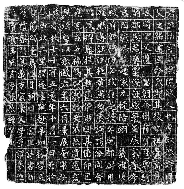 《曹君墓志》质地为红砂石,长约45厘米,宽约43厘米,厚约18厘米。分志盖和志身两块,志盖作盝顶形,四刹素面,边沿有些残损,顶部为一“田”字型,内有四个篆文,即“曹君墓志”,每字约12厘米。墓志大小与志盖一样,志文排列是由上到下,由右至左。先细线刻好方格,然后刻字其中。共竖行15行,满行15字,楷书,每字约2厘米稍强,总共219字(见图一、图二)。