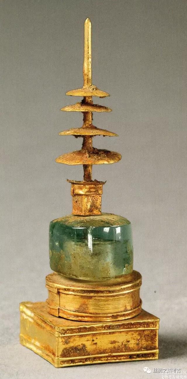日本平山郁夫丝绸之路美术馆收藏1件以黄金和玻璃制作而成的覆钵塔形舍利容器,高6.0厘米,台基呈方形,塔身分为两部分,上半部以玻璃制成,顶部呈略带弧度的覆钵形,在其下部有一圆筒状的孔穴,用以安置舍利;下半部以黄金制成,呈较为扁平的圆筒形。覆钵顶部有平头和四层相轮,其年代在公元2—3世纪(图四)[10]。