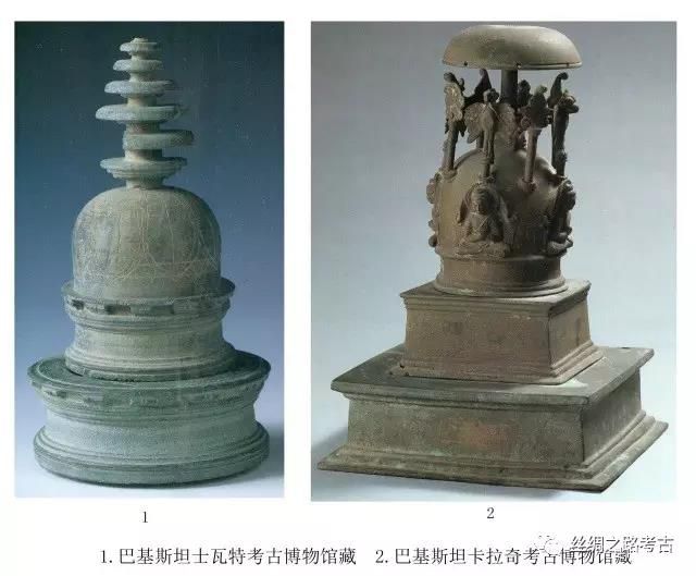 铜铸造而成的覆钵塔形舍利容器,相传出土于巴基斯坦士瓦特,现藏巴基斯坦卡拉奇国立博物馆。年代在公元5—7世纪,高39.4厘米。台基为二层方形束腰须弥座式,其上为炮弹形覆钵,在覆钵的四面分别有圆拱形龛及坐于龛内的坐佛,坐佛偏袒右肩施禅定印。覆钵的上方表面有8个孔,孔内插有8个圆形铜棍,其顶端分别装饰灵鹫和花叶,而且相间排列(图七,2)[16]。