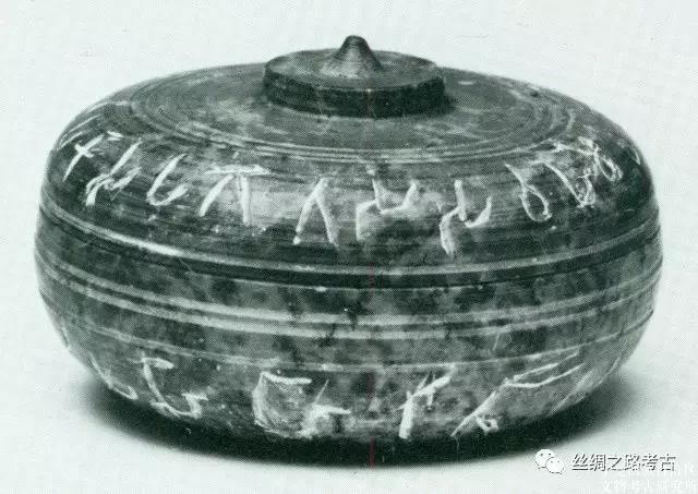 日本京都的龙谷大学博物馆收藏1件罐形舍利容器,相传出自巴基斯坦士瓦特,片岩质,轮旋而成。高6.4、最大径9.0厘米,年代约在公元前26年。整体呈扁球形,盖部与腹部以子母口扣合。盖顶部中央有一低矮的纽,其上部雕刻莲花瓣纹。在盖面之上阴刻两圈佉卢文铭文,经释读,其内容为:“阿布恰王·自在主布伊达米特拉的一个叫布拉赫娣雅的宫女,奉纳了舍利;32年,塔工事监督官撒马德拉·布阿那达·室利来那马达的弟子、测量工事监督官阿叔拉克西达雕刻。”关于其中的纪年,作为伊朗系的塞族王阿塞斯,大约是在公元前58年或者公元前57年登基,所以,铭文中的32年应该是公元前26年或者公元前25年(图一〇)[22]。