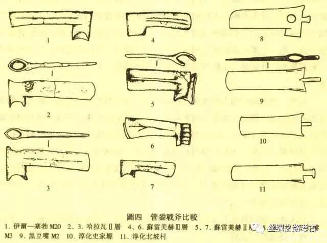 上文已经分析过夏代的喇叭口式耳环和套管式铜锛可能是通过新疆传到北方长城地带的。现在再分析两种可能也是从新疆传来的器物。一种是管銎战斧,一种是柳叶形短剑。