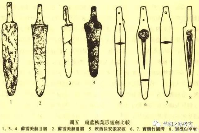 值得注意的是,也是在苏美雷赫Ⅱ、Ⅲ层中还出土了扁茎而茎上有穿孔的短剑(图五:1-4)[162] 。在中国考古学中,周人首先采用的扁茎而茎上有穿孔的柳叶形短剑(图五:5-7),起源久久不得其解[163] 。其实,早在1980年夏宿白先生到吉林大学来讲授“从考古发现看中西文化交流”专题课时,就谈到过扁茎短剑在中亚和西亚的编年都比中国早,特别介绍了伊朗鲁里斯坦的扁茎而茎上有孔的短剑在第二次世界大战后的发掘情况,以及70年代以后的编年研究[164] 。指出这对探讨我国青铜短剑的起源有好处。伊朗的发掘品表明,扁茎上的孔是装柄安铆钉用的,因为还发现了空心的铜柄和铜铆钉。但多数考古学研究者仍把目光局限在中国境内研究问题,以致这一意见久久未得到应有的重视。