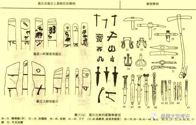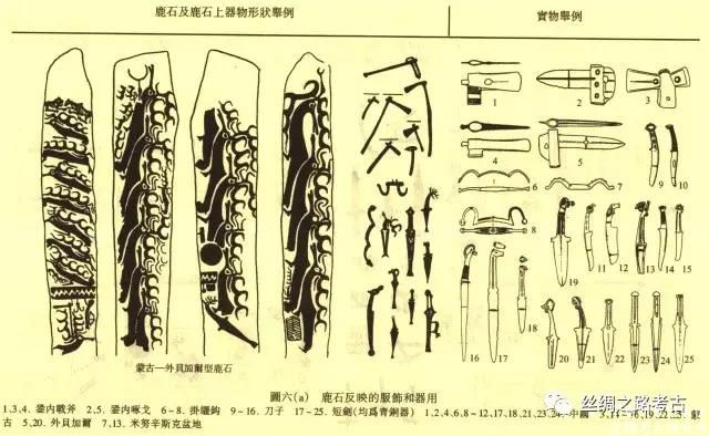 鹿石是一种人形石柱,与一种称为“凯列克苏尔”的石块构筑相关,两者可能都有祭祀方面的功能。鹿石上鲜有细致表现的人的五官,但常表现耳环和项链,以及剺面的创痕。中段有挂着各种器物的腰带。身上除盾和其他一些物件外,常常布满鹿形(可能是表现袍子上的纹饰)。也有全柱仅刻出许多鹿形的,“鹿石”即由此得名。它的分布东达外贝加尔,而各种变体向西直到东欧都有发现。伏尔科夫把鹿石分为两大类,一类是只有耳环、项链、腰带和器物,而不带动物纹的,这类鹿石在东方发现也不少,但大多数见于西方,故暂名为欧亚大陆型。另一类是有动物纹的。其中特殊风格化的,见于蒙古和外贝加尔,故称为蒙古-外贝加尔型。而作写实形的,分布在蒙古西部和阿尔泰地区(包括我国新疆的阿勒泰地区),故称为萨彦-阿尔泰型[166] 。据鹿石上的武器的形式可以大体推定其年代[167] ,则蒙古-外贝加尔型年代最早,其上有柄端饰动物头的刀子和短剑,但因这种短剑有明显的“凹格”,以我国出这种兽首凹格剑的昌平白浮墓的时代来推断,蒙古-外贝加尔型鹿石年代的上限约在前一千纪之初。萨彦-阿尔泰型鹿石上的短剑已是斯基泰-塔加尔式的了。上限当不早于前八-七世纪。可以推想,建造鹿石的人们,在还没有创造这种纪念石柱以前,已经生活于此地。而这个地区的人大约到前三世纪还在建造欧亚大陆型鹿石。所以鹿石上所表现的是将近一千年间蒙古高原及其邻近地区居民的典型服饰和器用(图六)。