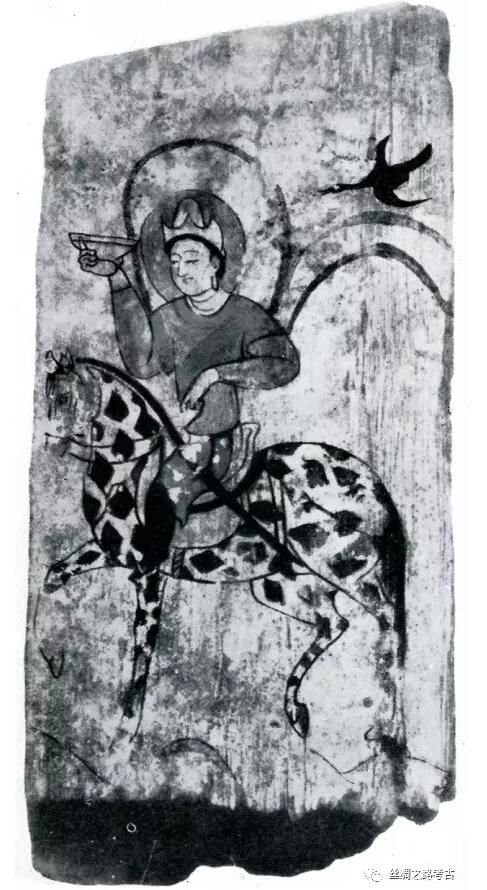 斯坦因從丹丹烏里克遺址獲得的木板畫D.X.5。木板上繪一人騎於馬上,頭戴尖頂翻沿多角氈帽,圓臉、細眉、細眼、直鼻、小嘴、長耳、短頸,頸有兩道弧線,頭後有圓形頭光,外著圓領短袖紅色袍服,上身內著緊袖衣衫,披帛飄揚於背後,腰間掛長劍,腳穿黑色長靴,坐於馬鞍之上,左手緊抓韁繩,右手屈肘抬起持一敞口有唇尖底或小底的器皿。頭後上方一黑雁展翅張嘴飛來。所騎之馬滿身黑斑紋,低頭下視,兩右腿抬起,馬尾下垂。(圖2)