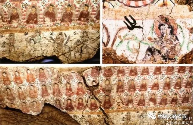 中國社會科學院考古研究所新疆隊在托普魯克墩2號佛寺遺址上也發現了類似成行的騎馬人物圖像。其壁畫殘塊原本的位置在迴廊南壁。壁畫殘塊上部殘存4行千佛,下部為一行騎馬人物像,首尾的兩身均殘留局部,中間的六身保存完整。馬均抬起右前腿,鞍具轡鑾齊全,作緩步行進狀,馬身均無黑斑紋。騎馬人均束髪戴冠,有圓形頭光,著圓領窄袖衣,腰繫帶,圓臉八字鬚,披帛飄於身體兩側,左手持韁繩,右手托鉢形器皿。器皿上方飛來一黑色雁鳥。頭光與衣服及披帛顏色有變化,第1身白色頭光,石綠色衣服;第2身綠色頭光,紅色衣服和披帛;第3身紅色頭光,土黃色衣服,紅色披帛中間繪黑線;第4身紅色頭光和衣服,綠色披帛;第5身紅色頭光,綠色衣服,灰黑色披帛;第6身灰黃色頭光,紅色衣服,褐色披帛;第7身紅色頭光,灰黃色衣服,綠色披帛;第8身灰黑色頭光,紅色衣服。(圖5)