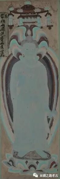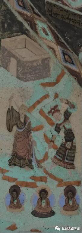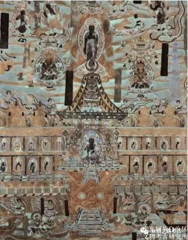 关于此铺图的时代,史苇湘等先生定在盛唐时期[2],王惠民先生修订《莫高窟内容总录》时改为五代[3],我们亲赴此窟考查后,认为无论从人物造型还是从绘画风格上看,均以盛唐较合适。此图内人物面相丰圆,身体壮实,尤其天王穿半臂,臂及腿扎行縢,着虎皮战裙的装束为唐前期武将常见形象;莫高窟五代时期现存壁画很少变色成灰褐色,而这对于唐前期的壁画则是常见的现象;主尊右下侧有几身千佛被后代用土红色重涂,有的土红色之下露底层的灰褐色,有的用土红色重描莲座后,与未经重描的身体部分相比较,明显比例失调,此土红色即甬道内五代边饰及垂幔之底色,在甬道北壁与顶的转交处还明显可以看出壁画的重层关系,因此我们认为此铺史迹画基本保持了盛唐时期的面貌。