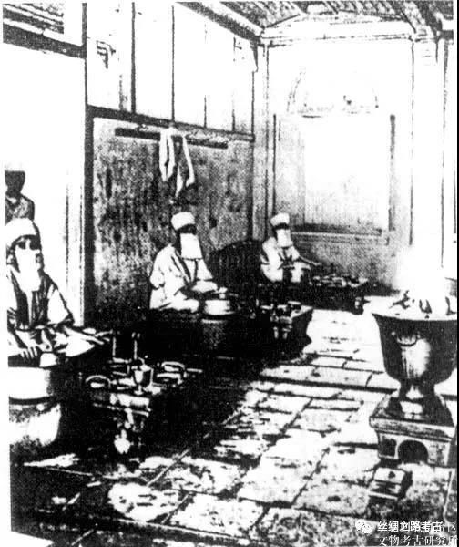 斯特拉波记载古波斯祆祠:“ ……中间有祭坛,坛上有大量的火烬。麻葛们保持着火永燃不灭。他们每天都到里面祈祷一个小时 ……在火前,他们披戴头巾,头巾垂至面颊, 遮住嘴唇。”6前面提到的卡尔库叶古城火庙:该屋中之火永不熄灭 ,有专人轮流照管。照料火的僧侣, 鼻口均有遮盖。他们用银钳夹小块柽柳木,投入火里。当火焰缩小时,便把木块一一投入7。(图二)