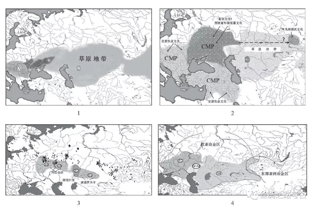 另一部比较详细的考古著作是契尔耐赫的《古代苏联冶金史》[3]和最近发表的《早期金属时代的欧亚畜牧文化草原带》[4]和《欧亚草原地带:碳十四年代序列和金属冶金区》[5],由于作者是研究冶金考古,所以使用的考古资料基本都是金属器,划分年代的标准也是基于金属与C14数据。第一阶段是黑海及其以西年代为公元前4700-4200年的喀尔巴阡-巴尔干冶金区(CBMP)(图二,1),其中分为三个文化。第二阶段是黑海至里海的环黑海冶金区(CMP),始于公元前4000的青铜时代,分布范围增大,早段为高加索的迈科普(Maikop) (4050-3050BC)为中心, 受两河流域的北部乌鲁克文化影响,晚段在更北的草原,颜那亚和洞室墓同时分布是在草原的东西部。在公元前2700-2100年颜那亚向东分布到阿尔泰,出现阿凡纳谢沃文化(图二,2)。第三阶段在草原地带的形成了西部的欧亚冶金区与东部的亚洲冶金区,这个格局一直保留到中世纪。欧亚冶金区的早期首先出现了由西向东的文化传播浪潮:阿巴舍沃(Abashevo)文化到辛塔什塔文化以及彼得罗夫卡(Petrovka)类型,随即有出现塞伊玛-图尔宾诺文化从东向西的传播(图二,3)。第三阶段的中期始于公元前2000年前后,欧亚冶金区进入稳定期,西部的木椁墓文化(Srubnaya)和东部的安德罗诺沃文化(Andronovo)分布范围广,形成两大联盟(图二,4)。晚期这一系统解体,公元前2千纪中晚期只有少量的堆纹陶遗存。亚洲冶金区是作者研究的薄弱环节,他认为这一地区最早开始的年代是与塞伊玛-图尔宾诺现象同时,它与安德罗诺沃文化同时并存于公元前2200-1700年,之后有300年缺环就进入到卡拉苏克文化阶段(BC1400/1300-900/800),这个文化东传3500公里,从萨彦岭到新疆-蒙古-华北-辽河-辽东,另一条线南下到晋陕高原,最后到晚商的都城安阳。作为冶金考古的专家,他的年代与文化划分方面,有大量的金属成分分析的数据。但是我们作为考古学家发现,在他展示的金属器中,从喀尔巴阡-巴尔干冶金区不断东扩,直到安德罗诺沃文化,最有代表性的器物是管銎斧,演变序列清晰,可以看出是一脉相承的;亚洲发源的塞伊玛-图尔宾诺遗存中大量的青铜器中唯独不见管銎斧,是以空首斧为主要器物,单刃刀也是亚洲起源。所以后者应该属于亚洲冶金区。管銎斧代表了公元前4千纪以来欧洲草原不断向东扩展的遗存[6],空首斧则是公元前2千纪开始亚洲森林草原兴起的代表性器物[7],在它背后应该有更古老的亚洲草原青铜器的孕育时期。这是我们与作者存在的第一个不同看法。第二点是关于卡拉苏克文化东传至中国商代的说法。这些地点确实出土了与卡拉苏克文化相似的青铜器,但是中国北方还有更多的同类青铜器,这些青铜器之间从形态学上是可以确定早晚的,而且他们的共生器物也有助于断代。我们得出的结论是与之相反的,即从早商的北部类型台西遗址和朱开沟遗址就已经出现了这类青铜器,它们从中国北方经过蒙古高原到达米努辛斯克,与当地发展起来的折背刀和菌首等特点融合在一起,形成东部草原的鼎盛时期,也是蒙古-中国北方冶金区范围最大的时期[8]。国外学者对中国北方青铜器缺乏了解,也说明我们没有把这些考古发现与研究介绍到世界。