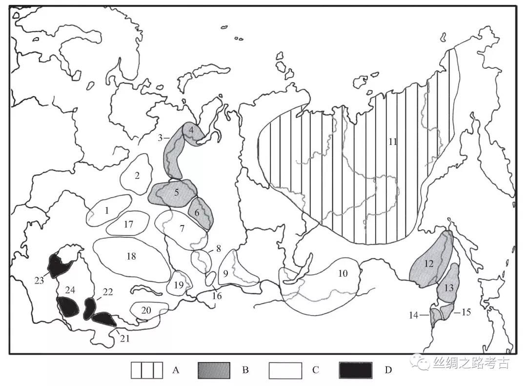 3.欧亚冶金区早段:草原的阿巴舍沃– 辛塔什塔– 彼德罗夫卡与森林草原塞伊玛– 图尔宾诺遗存(菱形图标)