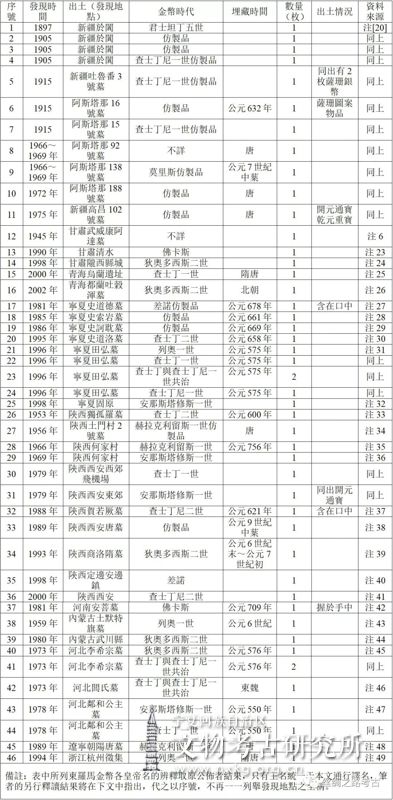 中國境內發現的東羅馬金幣及其仿製品,大體上可以分為兩類,第一種是在墓葬中出土,其次則為徵集品。從發表公佈情況來看,後者亦有二類,一是博物館等機構徵集,另外是個人收藏品。其他一些明顯由國外現代流入中國的東羅馬錢幣則不在我們討論範圍之例。我們根據以往公佈的東羅馬金幣的材料編制出金幣發現地點一覽表(表一)。