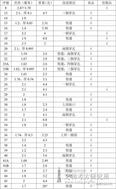 據以上有資料的三十六枚金幣中僅有八枚的重量在4克以上,占22%,假設4克左右符合原幣重量,那麼不合規定的金幣則多達78%,其中仿製品有五枚,4克的仿製品只有兩枚,這樣約二十五枚的真品金幣中,只有四分之一左右的金幣合乎真品重量,其餘近百分之八十的金幣都與真品的重量相去甚遠。45號金幣最重4.4克,38號則最輕只有2克,重量資料齊全真品平均重3.15克,有五枚金幣的外觀明顯改變。改變外觀的方式是剪邊,剪邊時或許存在某種標準,即以不傷害金幣圖案正中的王像為原則,但是周邊的拉丁字母,顯然不是持剪者所顧忌的內容,有的金幣邊被全部剪去。金幣左側剪去的機會大於右邊,姑往往右邊的銘文遺留下的情況多於左邊。影響金幣重量的因素不但有剪邊,幣面上打孔也會使金幣的份量減輕。金幣上的穿孔從一個到二個、三個,最多23A號金幣上有四個穿孔。一個穿孔或像35號金幣焊有一小圓環,明顯是為了防止遺失,用於懸掛時穿線;但三個甚至四個穿孔很可能是為了綴合在某種物品、物件之上,衣物或許是應首先想到的物件。相當一些金幣被剪邊,幣面上仍有穿孔,很可能經過這樣工序:在某一地區金幣先被剪去周邊,流傳至最後擁有者的手中又被打上穿孔,以防遺失或便於綴合。仿製品的重量較輕,最少的兩枚只有0.8克,單面打押圖案是仿製品常見的形態。金幣沒有受到改造的情況比較少,似乎與埋藏年代的早晚之間並無明顯的聯繫,亦與擁有者身份不相關,其中的規律尚需進一步研究。表面磨損對金幣來說最為常見,磨損的程度當然與流傳的時間長短有關。金幣在打造後相當長的一段時間是作為貨幣參與流通環節,磨損是必然的。流入中國的外國金銀幣在退出流通後被擁有者收藏,埋入墓葬是一個普遍的選擇。以同時流行的薩珊銀幣為例可以觀察到,薩珊銀幣在外觀改造上遠不如東羅馬金幣,幣面打孔的現象已經十分少見50,剪邊的情況甚至稱得上罕見。當然對於薩珊銀幣的剪邊,薩珊王朝曾經採取過一些防範措施,如在銀幣周邊打上某些符記以防剪邊51。我們尚不知在拜占庭帝國有無類似的防止剪邊的方法,不過從拜占庭金幣的直徑看,同樣的方法可能沒有,但用薩珊銀幣的例子可反推出貴金屬貨幣被剪邊是一個普遍的現象,對於數量眾多的金幣實施剪邊,當然可以得到相當可觀的黃金,拜占庭本土、薩珊地區及中亞是金幣大量流通地區,金幣剪邊的可能性最大。相反,流入中國的金幣數量十分稀少,即使剪邊意義也不大。擁有者為防止遺失或綴合在他物之上,對金幣採取了打孔的辦法,使金幣的形態、分量都大為減少,表明擁有者並不關心其中的份量,這樣的推論使我們清晰地排除拜占庭金幣在流傳過程中幣面被改造的程式。