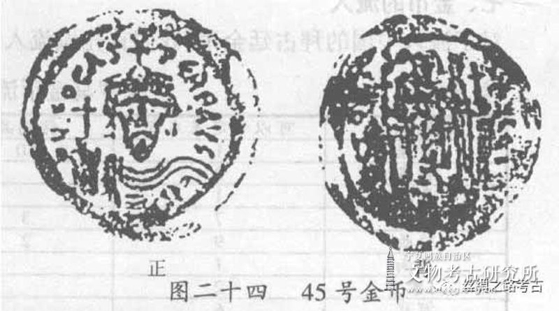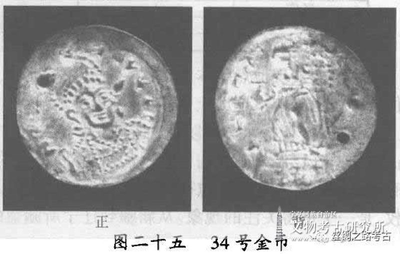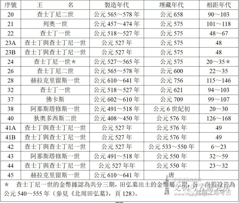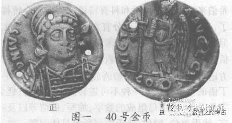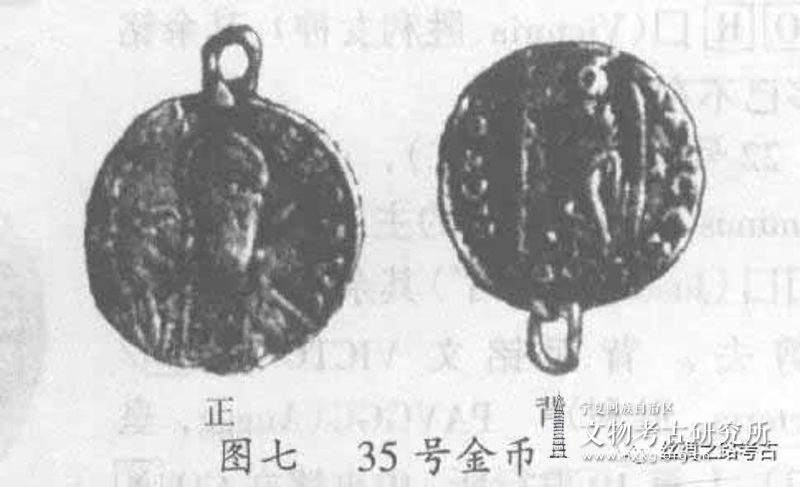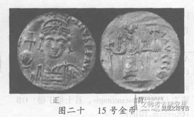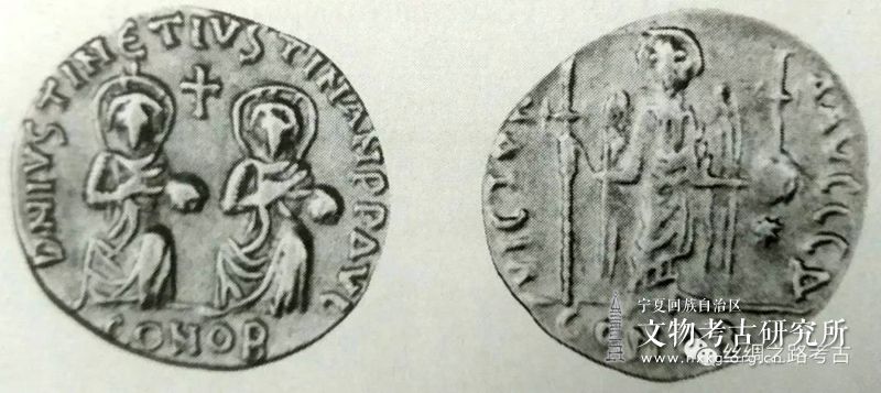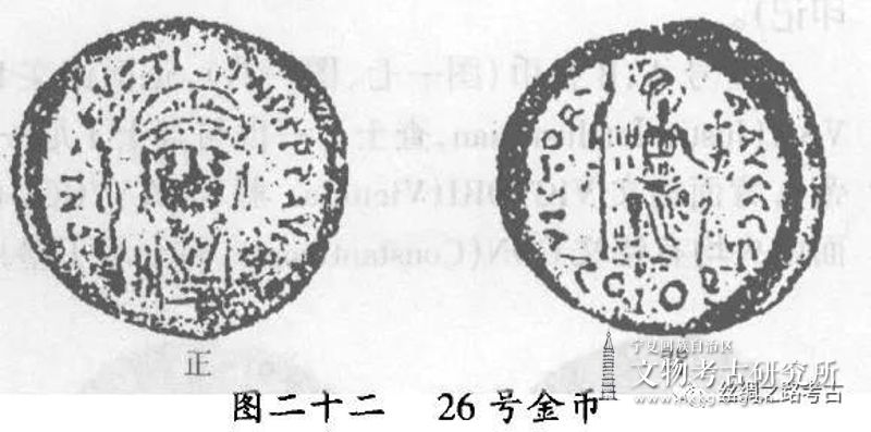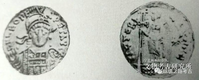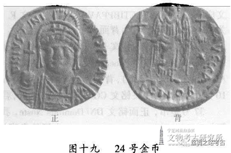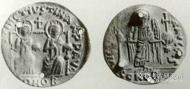 81 原報告稱金幣為查士丁尼二世,有誤,其實他的原意是查士丁二世(Justin Ⅱ,西元565~578年),查士丁尼二世(Justinian Ⅱ,685~695年)金幣在中國境內並沒有發現。這枚金幣實際上是查士丁一世(Justin Ⅰ,518~527年)。但比較奇怪的是與此完全相同的一枚金幣發表在《中華文明傳真·隋唐》一書中卻稱“發現于唐長安城的何家村窖藏”[尹夏清著,上海辭書出版社、商務印書館(香港),2001年,頁38]。不過,非常遺憾的是在這本印刷非常精美的畫冊中,這枚金幣卻被印刷者置放成反面。發表者中應有人將金幣的地點搞錯。