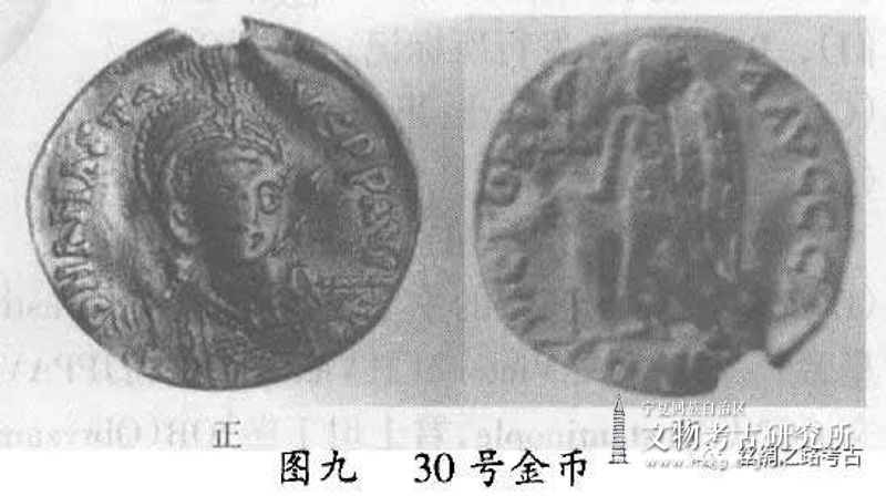 30號金幣(图九),正面有一缺口銘文DN(Domirus Noster,我們的主上)ΛNΛSTA/囗IVS(Anastasius,安那斯塔修斯)PPAVICG(Perpetuus,Augustus,永恆的皇帝)。背面VICTORI/A(Victoria,勝利女神),AVGGG(Auggg,皇帝們),A,第1發行所標記。中央CON(Constainople,君士坦丁堡)OB(obryzum,印記)。