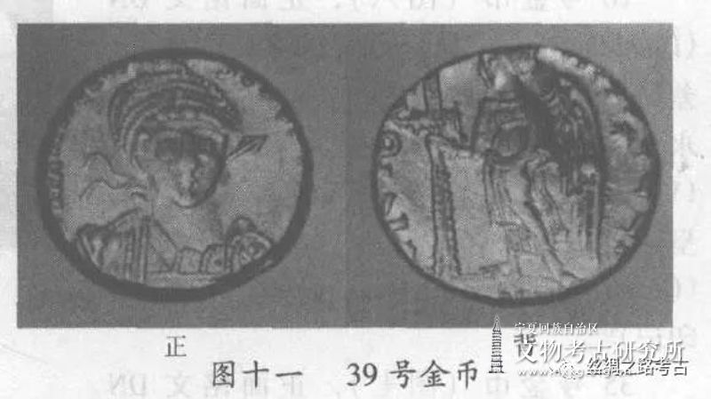 39號金幣為狄奧多西斯二世的半身胸像,他是拜占庭帝國的第八位皇帝,在位的年代正是帝國希望上升的年代。正面皇帝半身胸像,頭有三分之一側向。頭戴盔,盔額飾有兩周聯珠紋,頂部兩根翎羽飾被穿孔打破。腦後有兩股冠纓翹起,冠下兩側珠子垂於雙耳之下。身著無領皮革戰袍,外飾鎧甲。鎧甲呈橫豎條狀,飾有甲片。右手舉起,握一中型矛柄,扛於右肩上,矛尖露于左耳際,是權杖的象徵。左手持一盾牌,盾牌上部呈圓三角形,擋住左肩,盾上有圖,但並不清晰,一般認為是作戰圖之尖。金幣正面與背面圖案打押正好相反,有人以為這是拜占庭廷金幣印模排列的常例61,也有人說工匠心不在焉,轉動上模,打出的幣兩面的圖文就不都順著一個方向62。後者顯然有些想當然成分的推測,在一般研究東羅馬金幣的印刷品中,這一現象顯然不易獲得觀察。因為它們的排列是按照圖案調整,以正面為主調節背面圖案,除非觀摩實物。流入中國的金幣有些打有穿孔,則有助於正、背圖案相關察看。除這枚金幣外,13、16、20、21、22、23A、23B、26、30、32、34、35號金幣都是正背面案相反排列,顯然可以看作是拜占庭金幣在印模排列上的一種慣例,有例外的情況十分少見。背面為勝利女神,側身向右做佇立狀,頭側向右而身子呈正側,右手執一長十字架,頭部與十字架間有一顆八芒的星,女神左側有長翼,周有拉丁銘文。