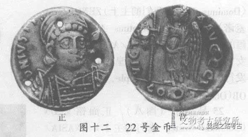 22號金幣(图十二),正面銘文DN(Dominus Noster,我們的主上)IVST囗/囗囗囗(Justin,查士丁)其餘的銘文全部被剪去。背面銘文VICTO R I/(Victoria,勝利)P PAVGGG(Auggg,皇帝們),Ⅰ,第10發行所。中央銘文CO N(Constantinople,君士坦丁堡)囗B(obryzum,印記)。